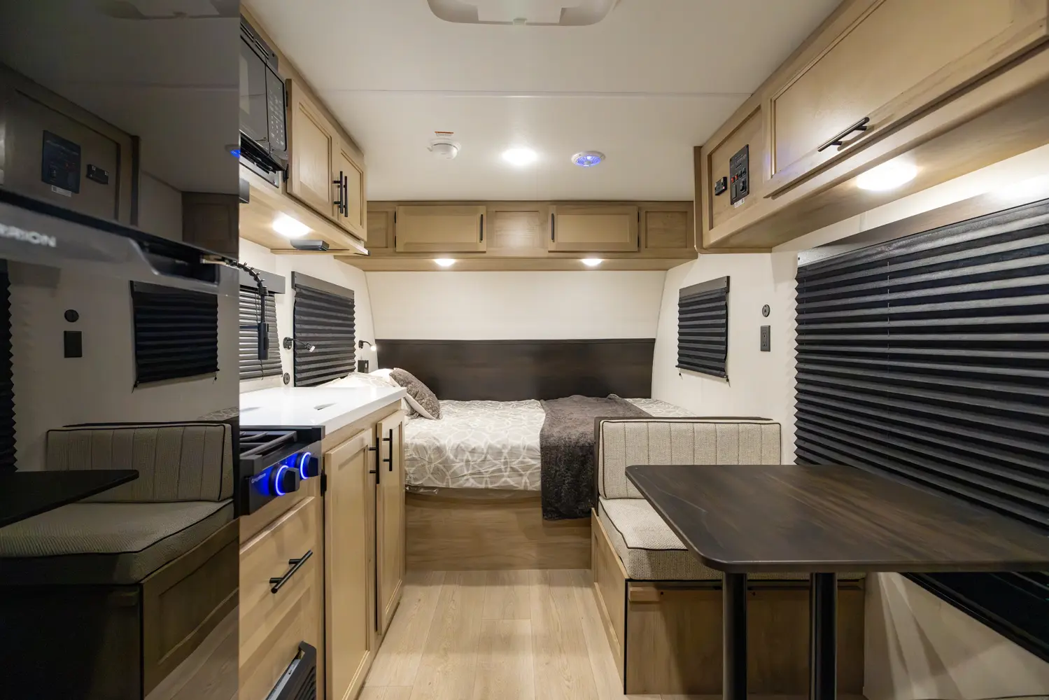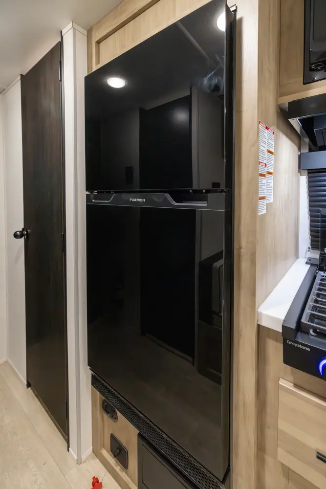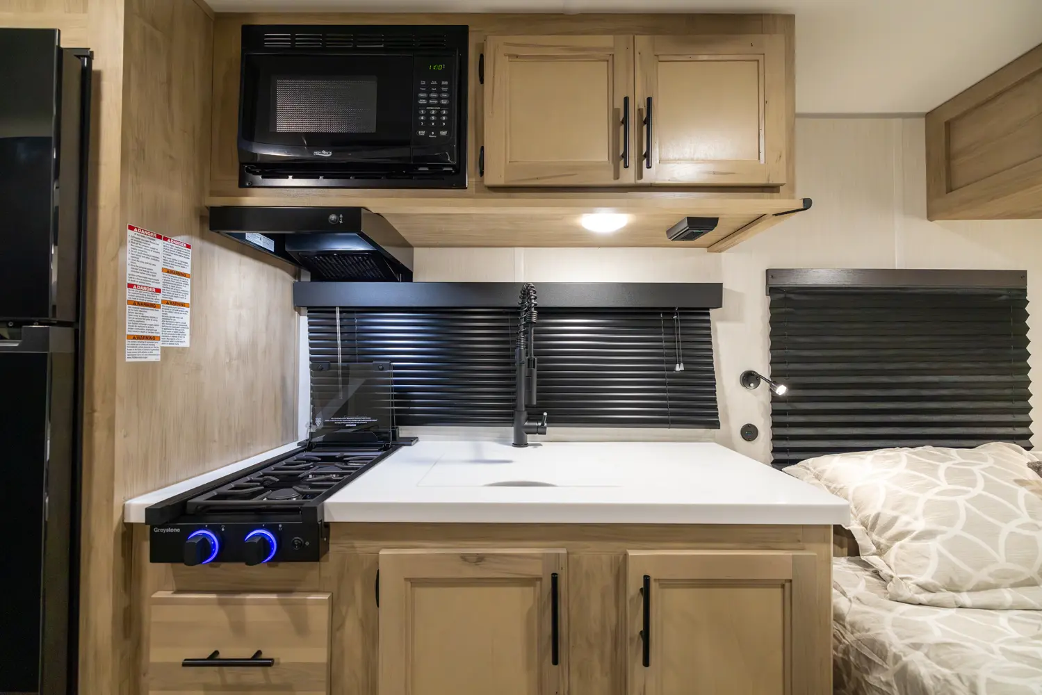 This 19’ travel trailer packs a lot of features in a small space. The rear entry design creates a split bath that allows you to use bath facilities simultaneously. Despite the trailers size nothing is lost in the kitchen which features a flush mount glass cook top, huge sink, ample counter space, and a segment leading 10.3 cu.ft. double door refrigerator.
