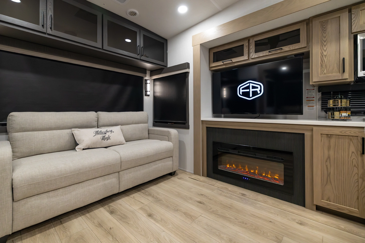 This elegant rear living unit offers a 76" hide-a-bed sofa, 60" theater seating, and a fireplace with TV for ultimate relaxation. The kitchen features an island, pantry, and ample counter space, while the dining area includes a table with chairs and bench seating. The front bedroom boasts a king bed, washer/dryer prep, dresser, and wardrobe storage. With dual awnings and pass-thru storage, it’s built for comfort and convenience.