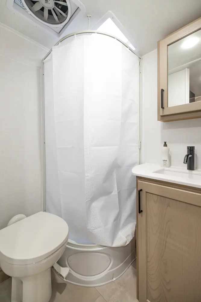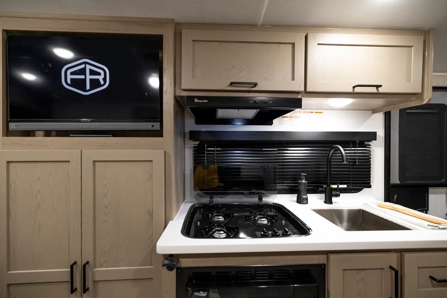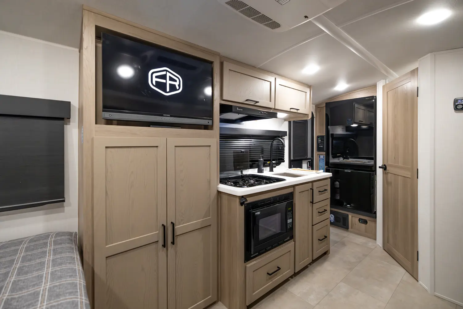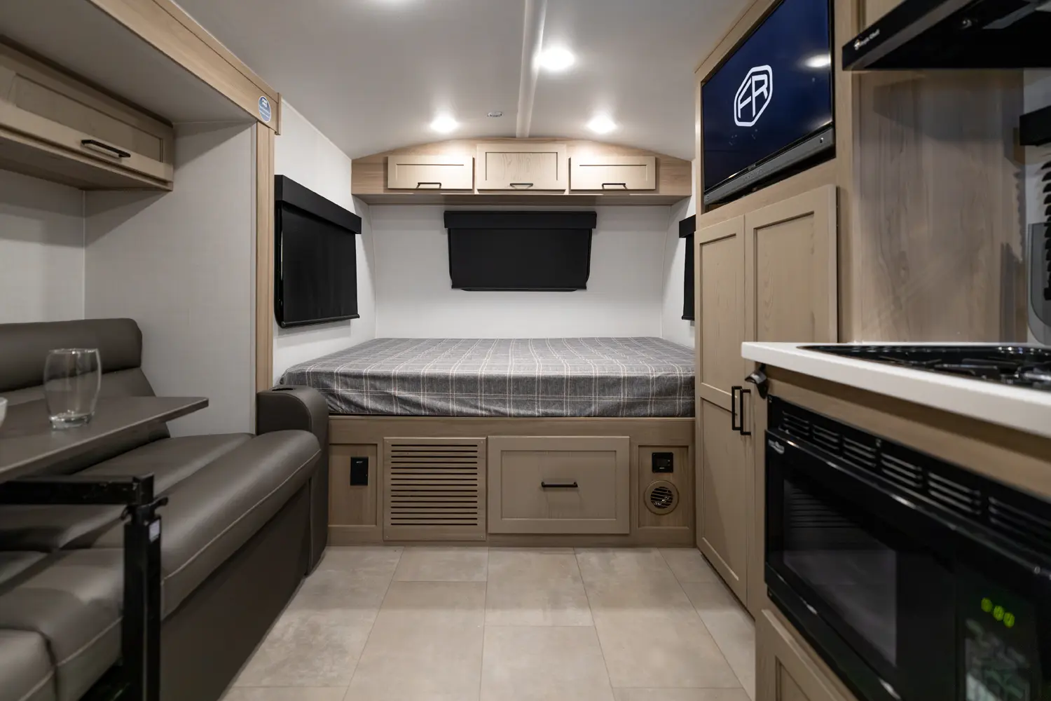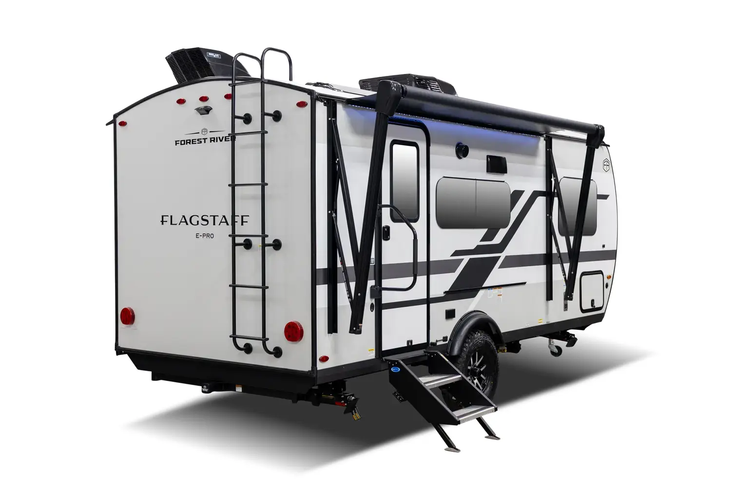 The Flagstaff E-Pro E19FBS is a rear entry couples coach with a small slide that offers so much great space. The large bathroom is one of the best features of this small couples coach. The 72” sofa also makes for a great bed for guests, children or pets. At 20’ and light weight, you will not be able to get more walk around footage than this great couples coach.