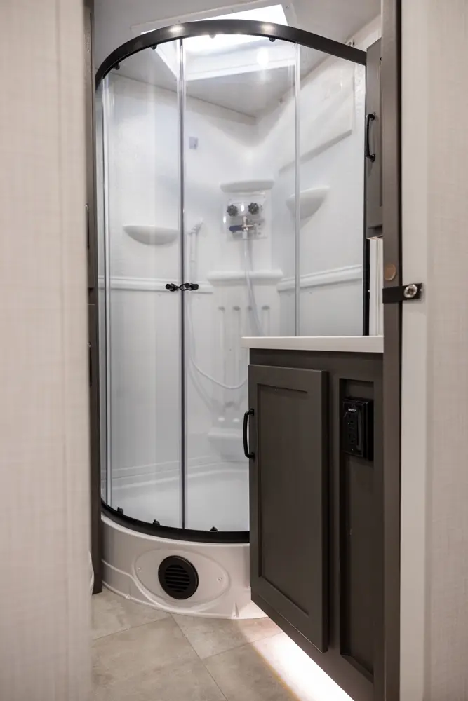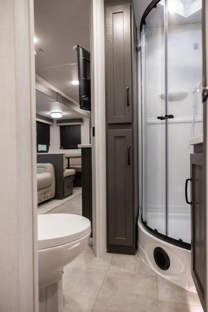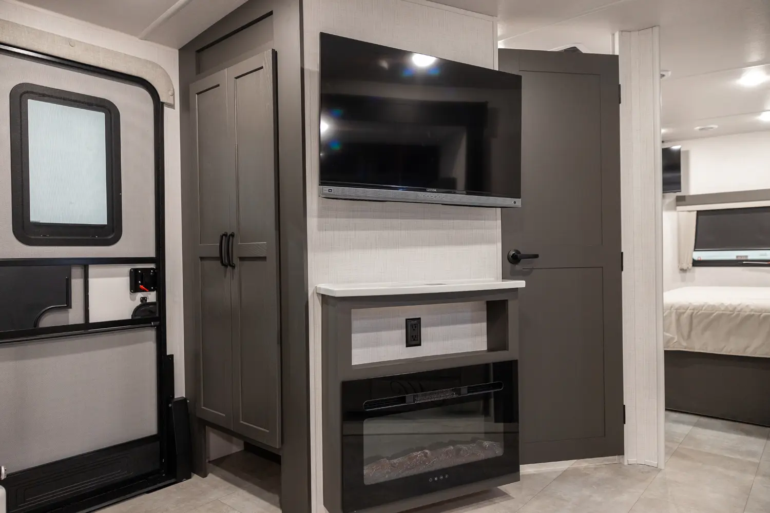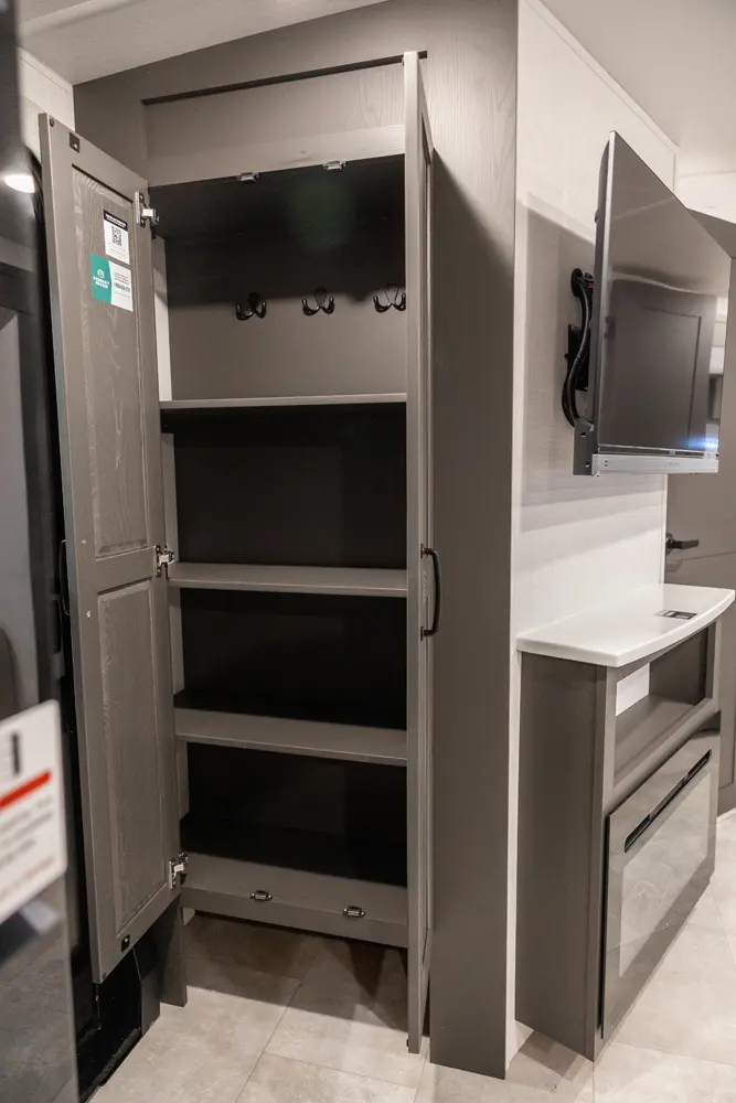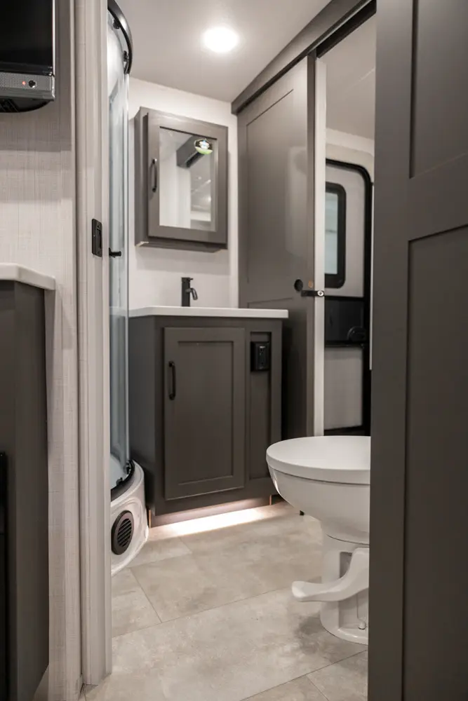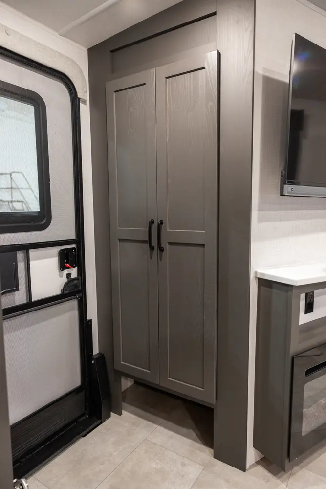 Holy counter space! This front kitchen offers a ton of counter space with a giant window to enhance the camping experience. The 67" theater seating is conveniently located right in front of the entertainment center and the cozy space heating fireplace. The master bedroom offers a big 60"x 80" queen bed slide out which makes the room feel residential. This bedroom has a separate entry and exit door that is also covered by the giant 21' awning.