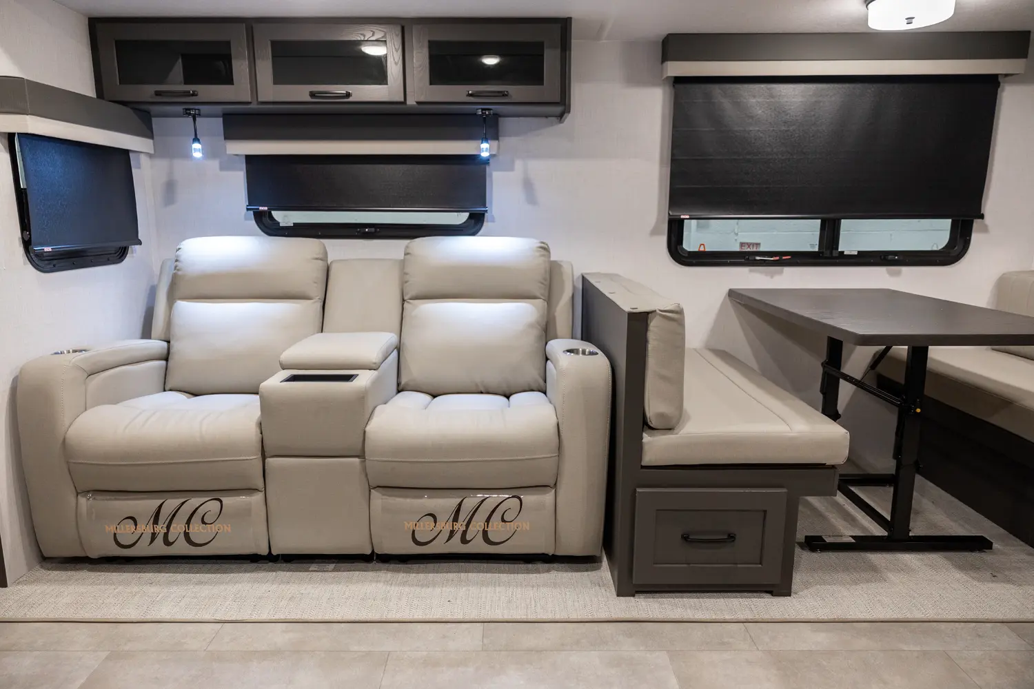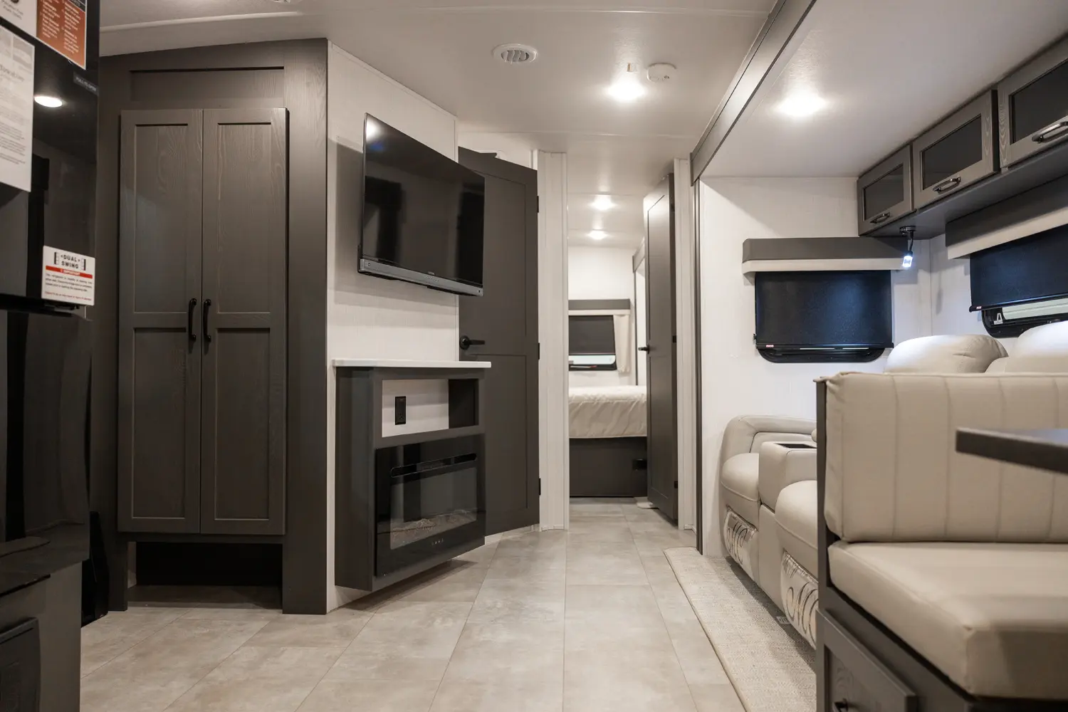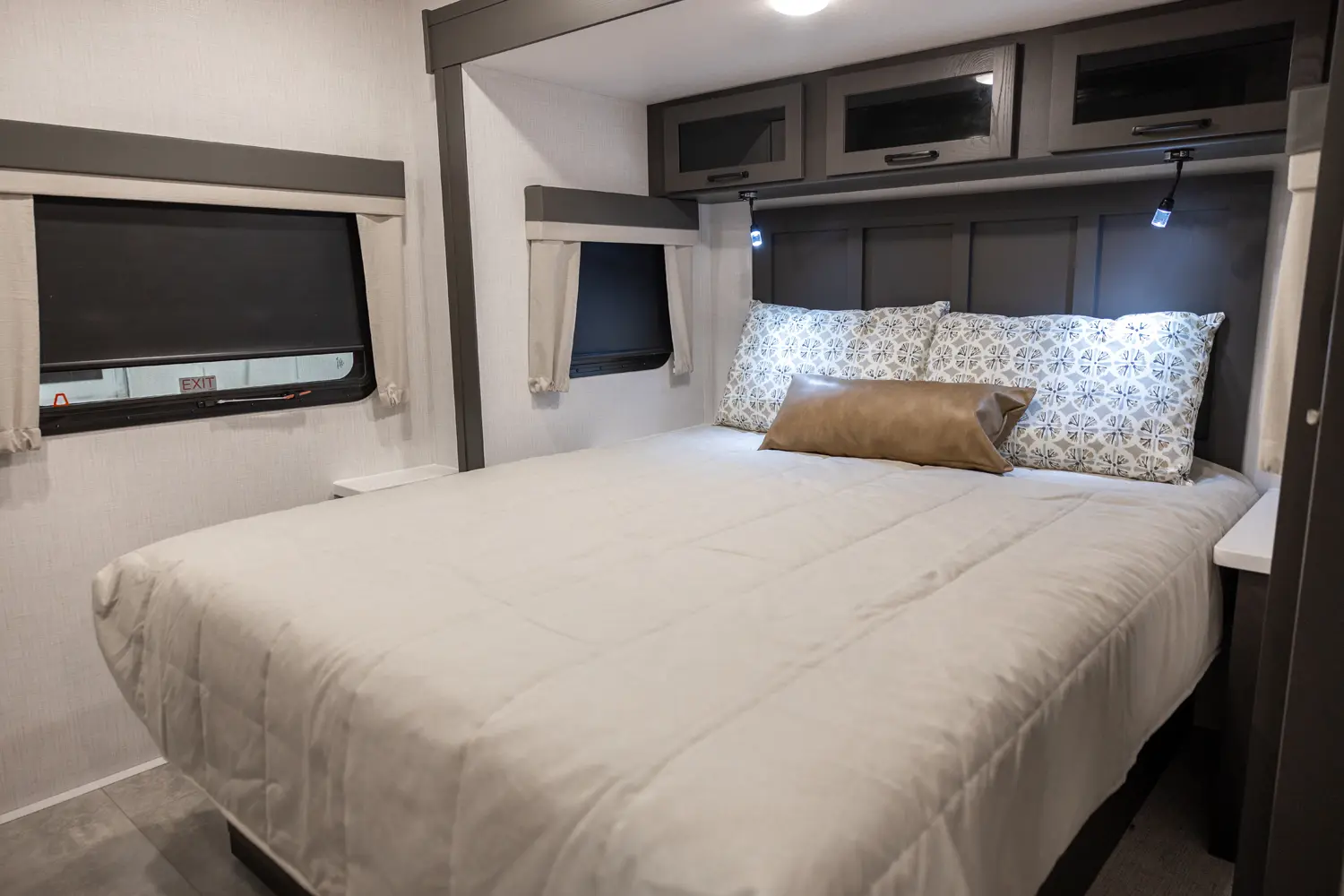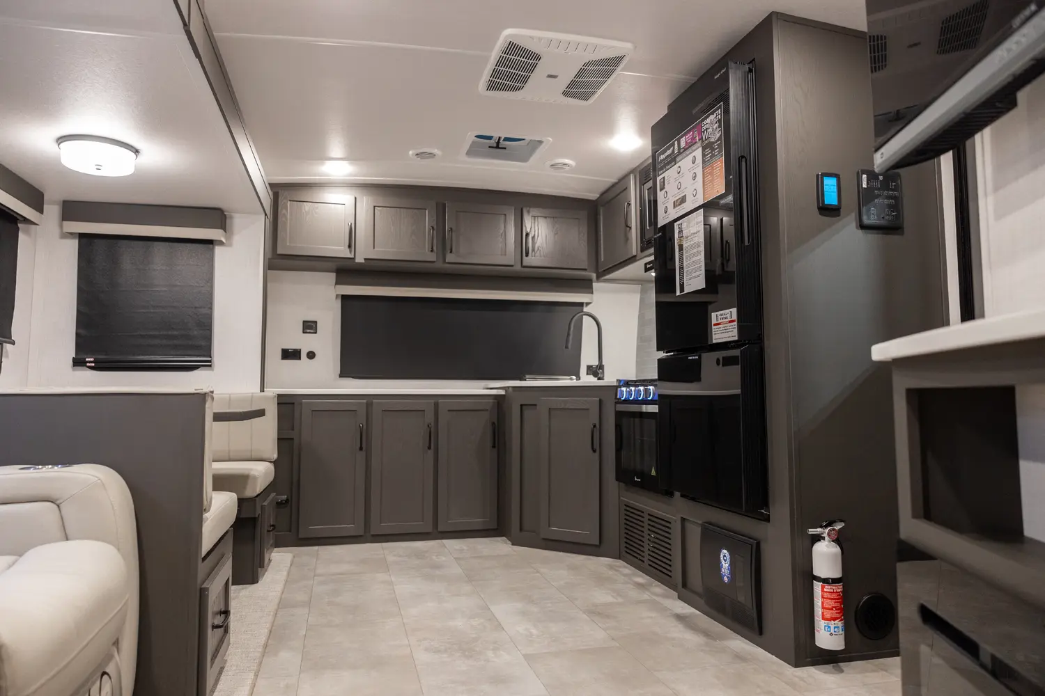 Holy counter space! This front kitchen offers a ton of counter space with a giant window to enhance the camping experience. The 67" theater seating is conveniently located right in front of the entertainment center and the cozy space heating fireplace. The master bedroom offers a big 60"x 80" queen bed slide out which makes the room feel residential. This bedroom has a separate entry and exit door that is also covered by the giant 21' awning.