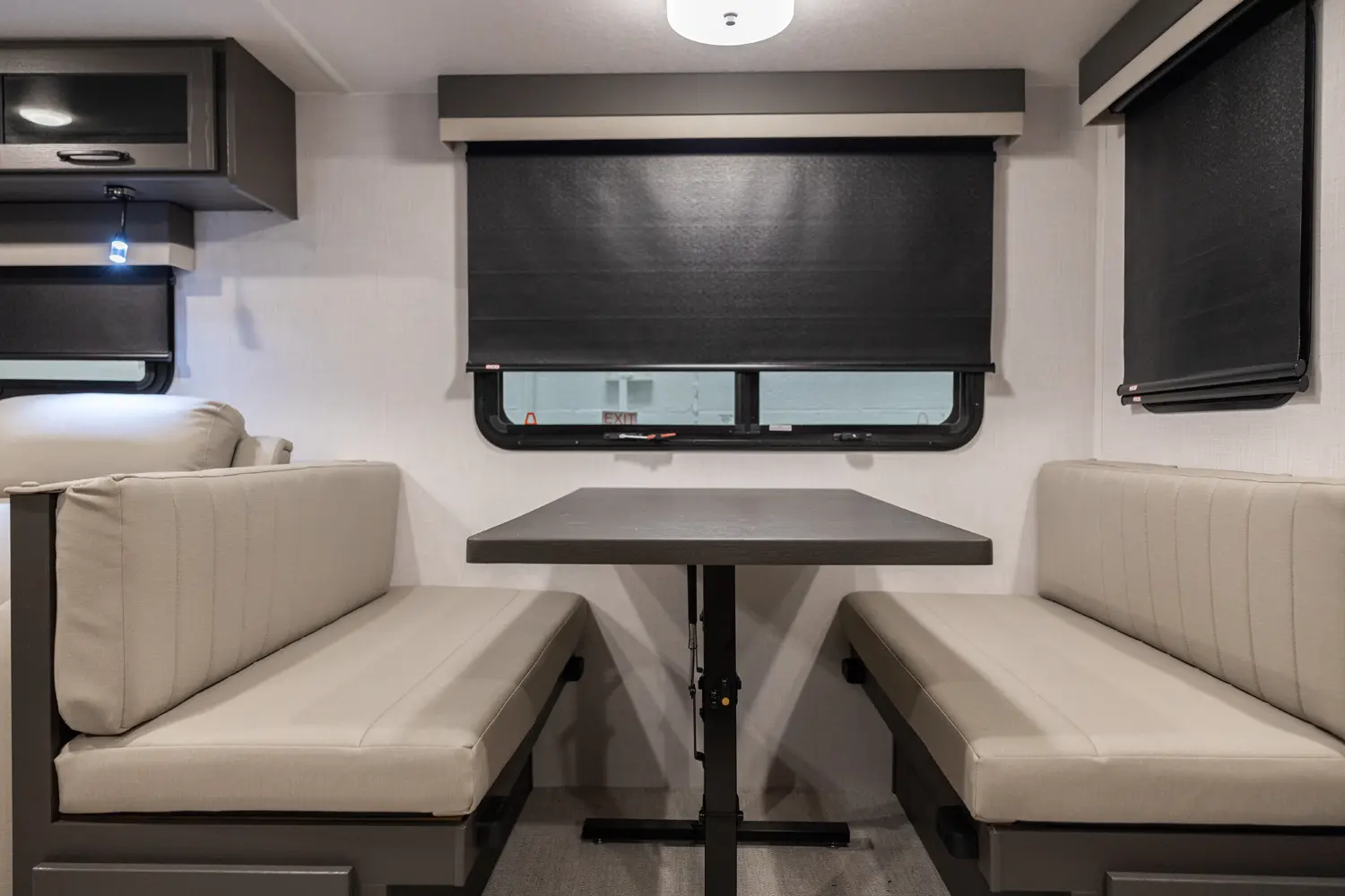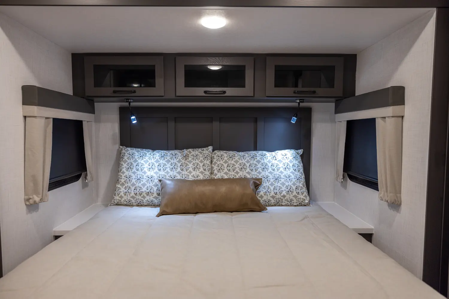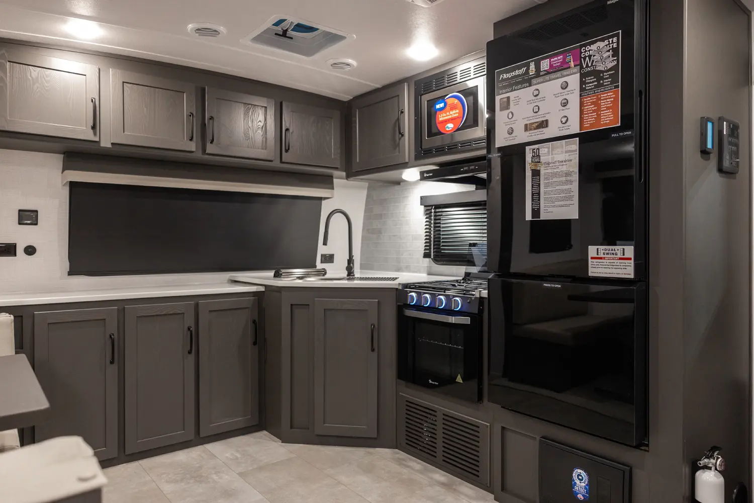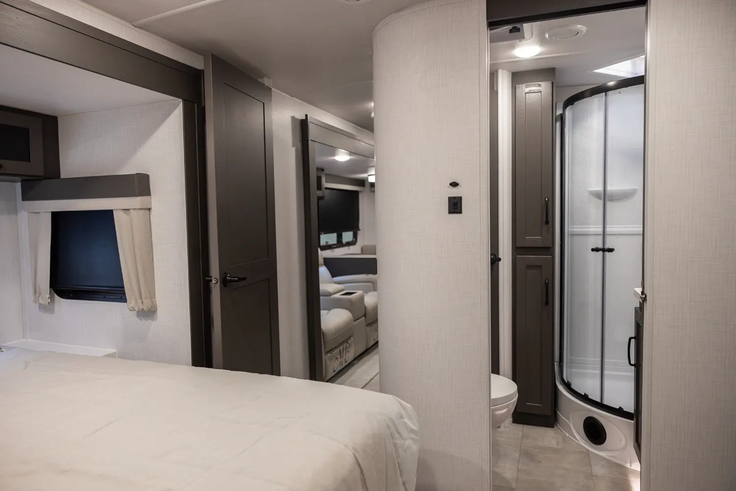 Holy counter space! This front kitchen offers a ton of counter space with a giant window to enhance the camping experience. The 67" theater seating is conveniently located right in front of the entertainment center and the cozy space heating fireplace. The master bedroom offers a big 60"x 80" queen bed slide out which makes the room feel residential. This bedroom has a separate entry and exit door that is also covered by the giant 21' awning.