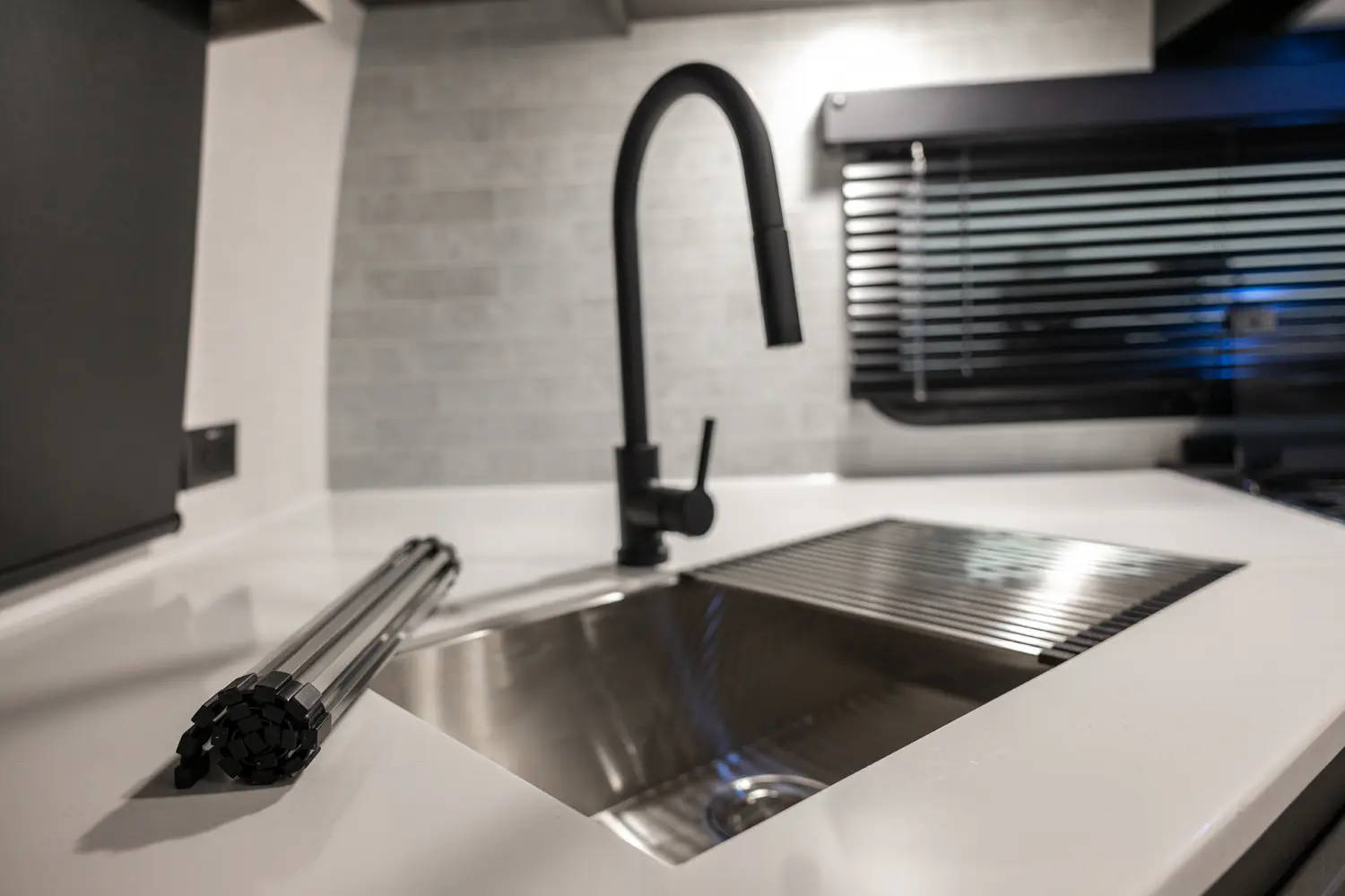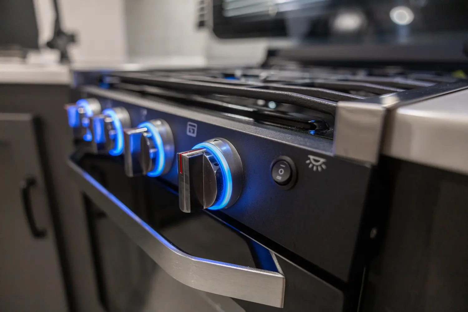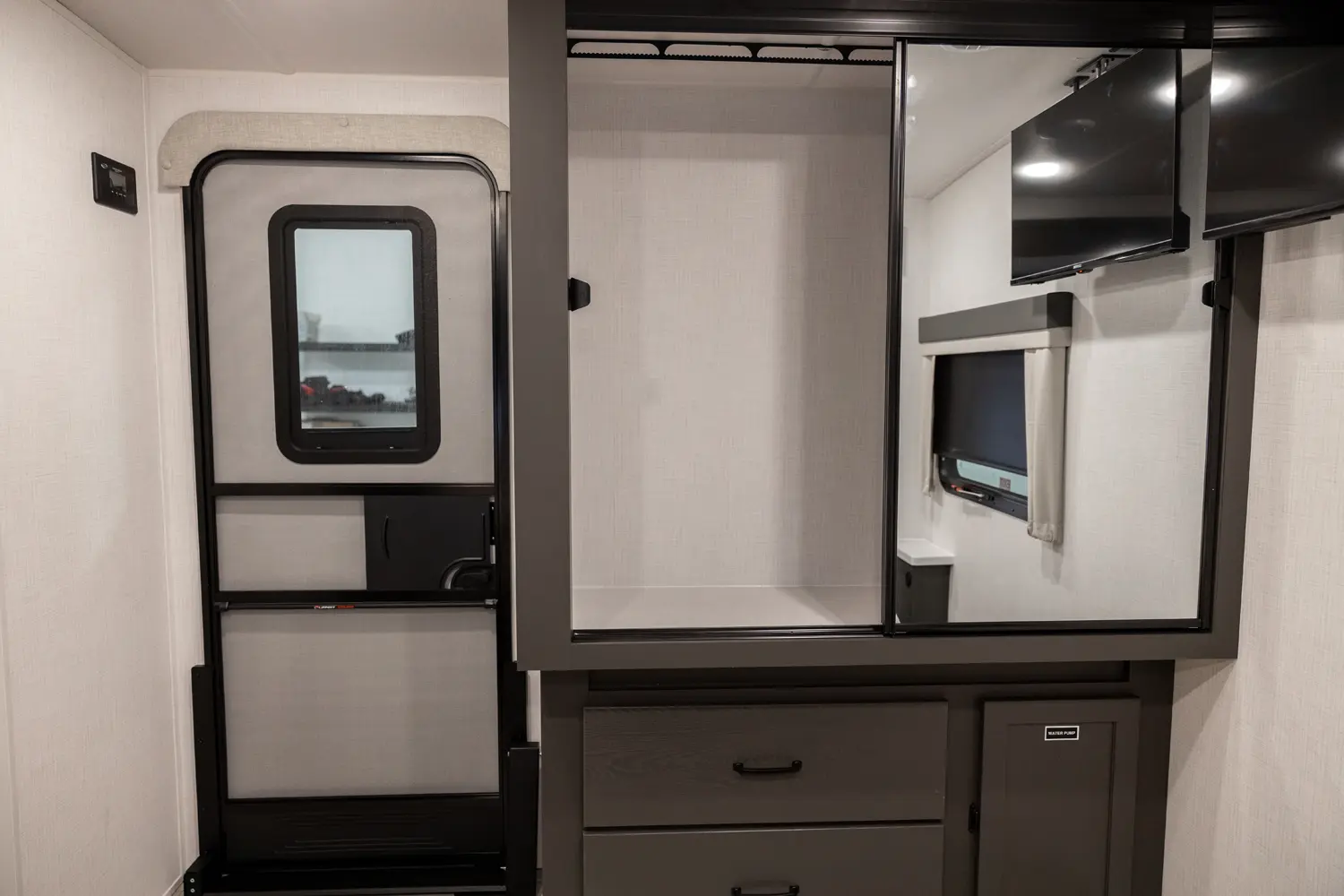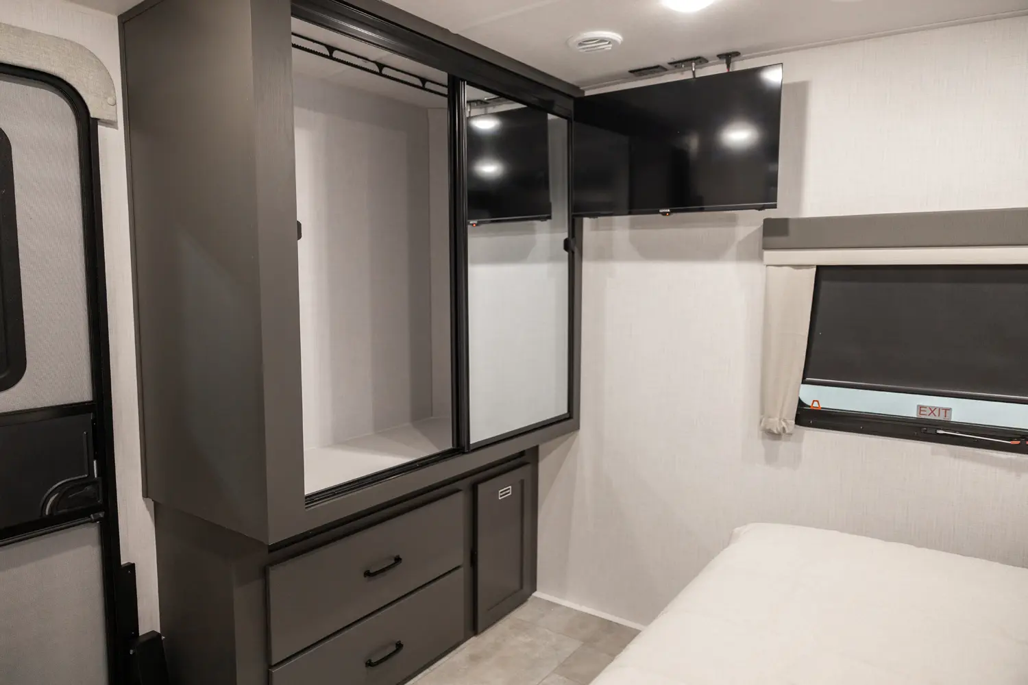 Holy counter space! This front kitchen offers a ton of counter space with a giant window to enhance the camping experience. The 67" theater seating is conveniently located right in front of the entertainment center and the cozy space heating fireplace. The master bedroom offers a big 60"x 80" queen bed slide out which makes the room feel residential. This bedroom has a separate entry and exit door that is also covered by the giant 21' awning.