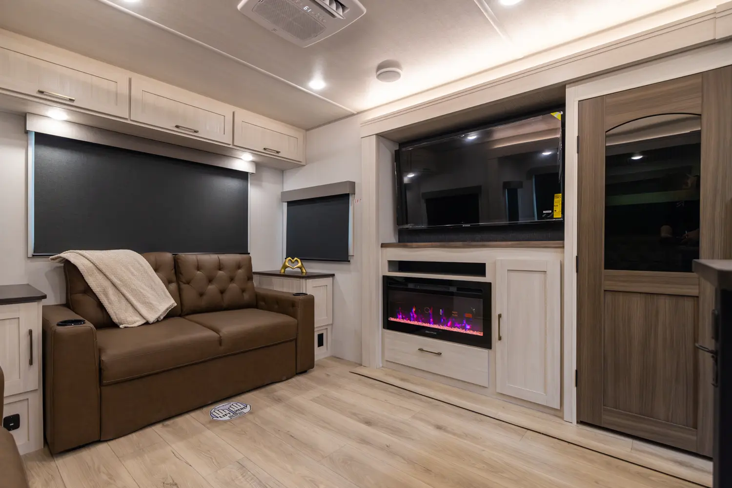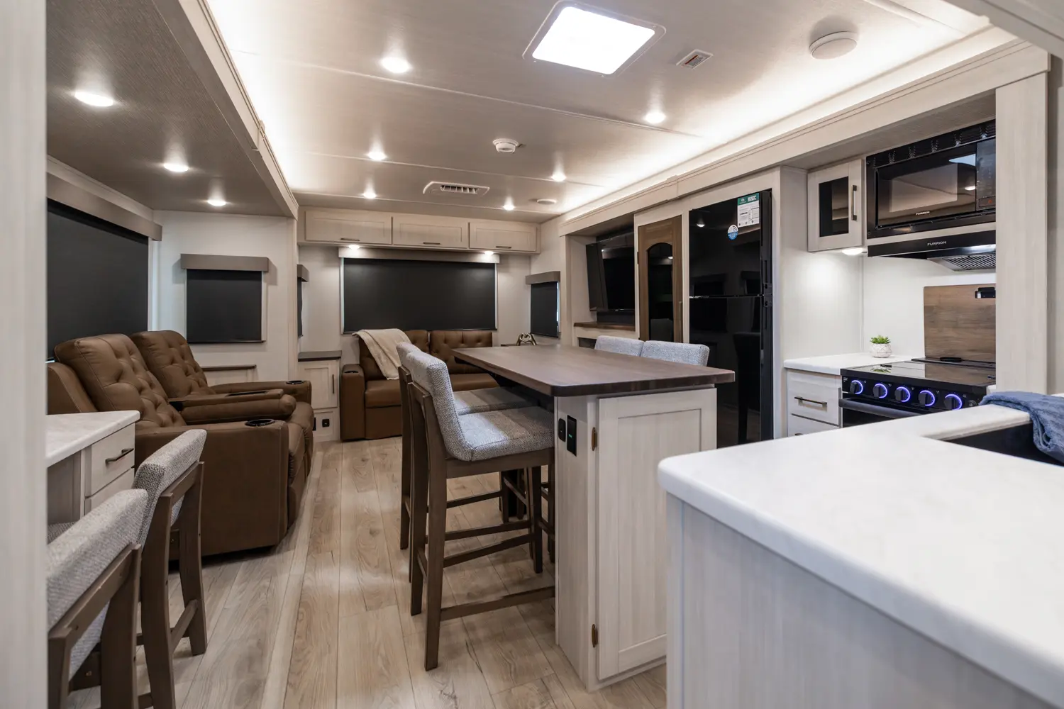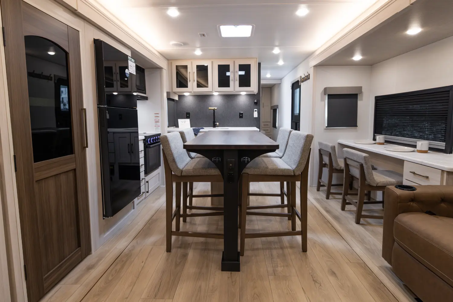 This 36' 7" travel trailer offers a spacious rear living area with dual opposing slides, creating an open, inviting space. The modern kitchen is equipped with a 10 cu. ft. 12V black glass refrigerator and a 3-burner residential-style range with glass cover. The custom king bedroom suite features ample storage, motion lighting, and a privacy wall. Exterior features include a 12' electric awning with LED lights, outdoor camp kitchen, TrailGate outdoor bar, and a hot & cold spray port.