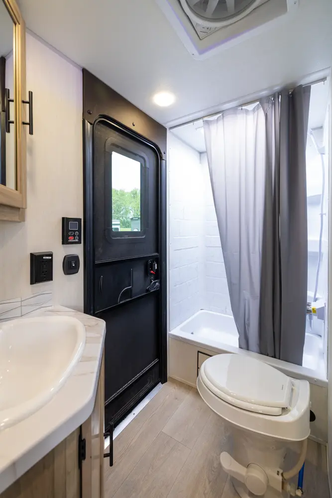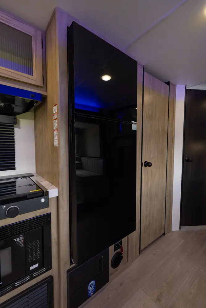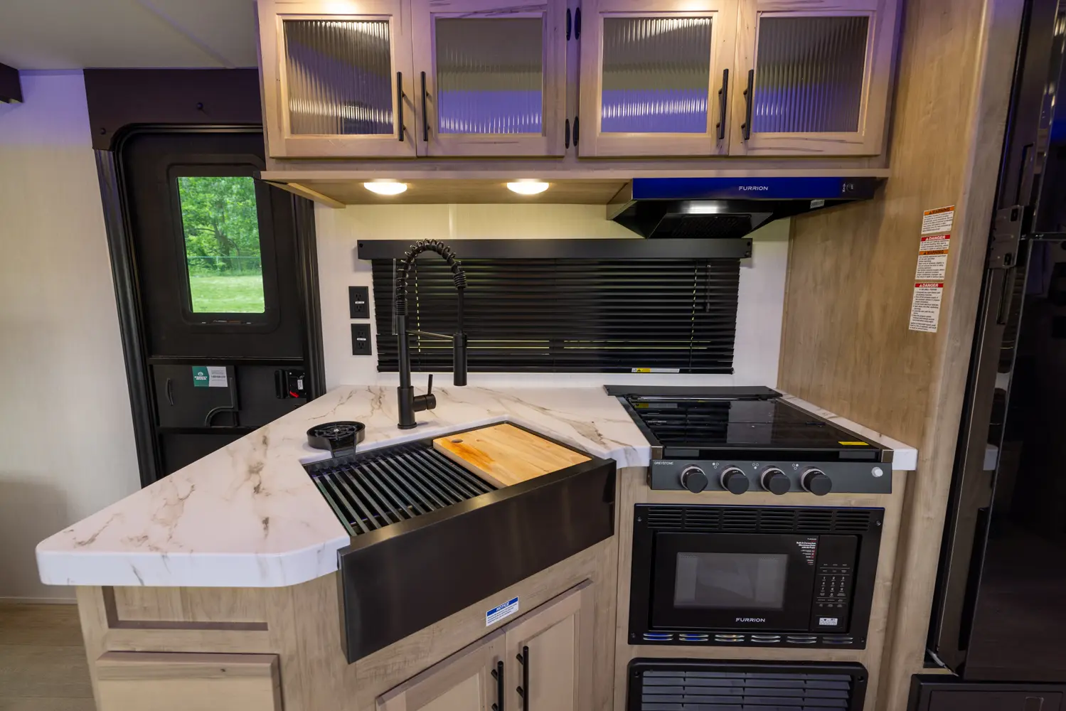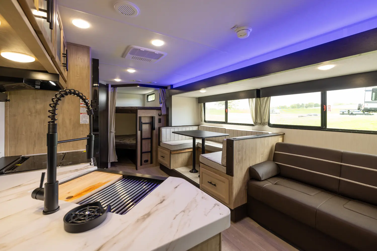 The Grey Wolf 26DBH by Forest River is a spacious and versatile travel trailer, perfect for families. The double entry and outdoor bathroom access provide convenience, while the double bed bunk offers extra sleeping space for kids or adults. The modern kitchen, with an oversized pantry and a large U-shaped dinette, provides ample storage and seating. The exterior features a full outdoor kitchen, speakers, and a TV bracket, perfect for outdoor entertaining.