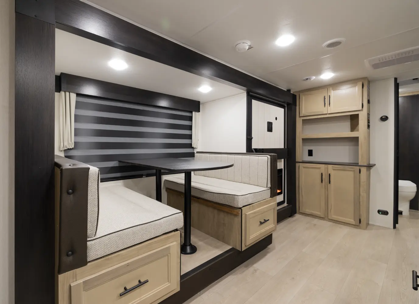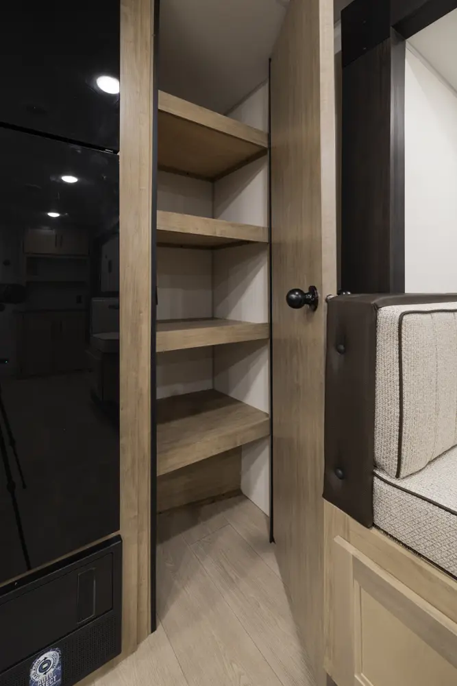 The Cherokee Grey Wolf 26SS by Forest River is a compact yet luxurious travel trailer. Its rear kitchen layout, combined with a large dinette, air fryer combo microwave, 12-volt refrigerator, and ample prep space, makes it perfect for cooking and entertaining. The spacious living area features a convertible sofa for additional sleeping and a hidden pantry for convenient storage. The primary suite, with a king-size bed and ample storage, offers a comfortable and stylish retreat.