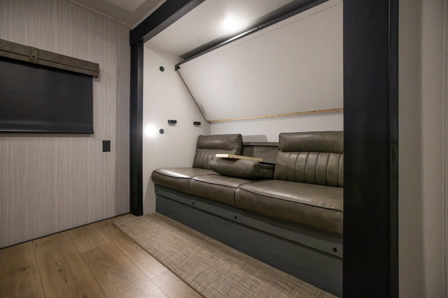 This rear bunk travel trailer provides great space for you and all of your family. With three slides, all on one side of the unit, it will grant you and the guests room everywhere you go. The L shaped countertop in the kitchen gives you the ability to entertain without feeling cramped. The front bedroom has a slide out containing a bed, along with a deep closet. Furthermore, you are provided with a great deal of natural light through out with windows in every room.