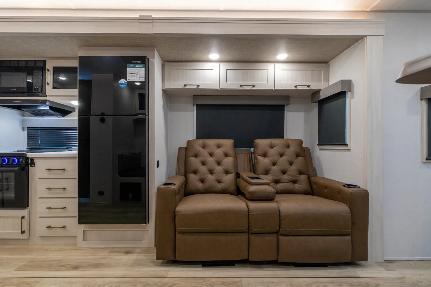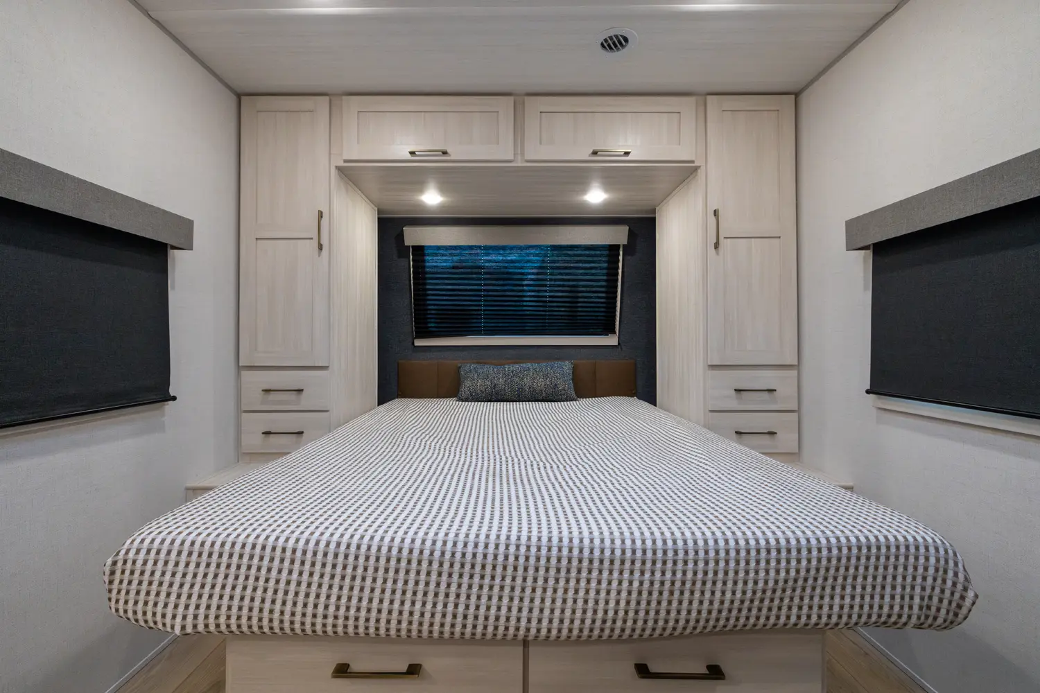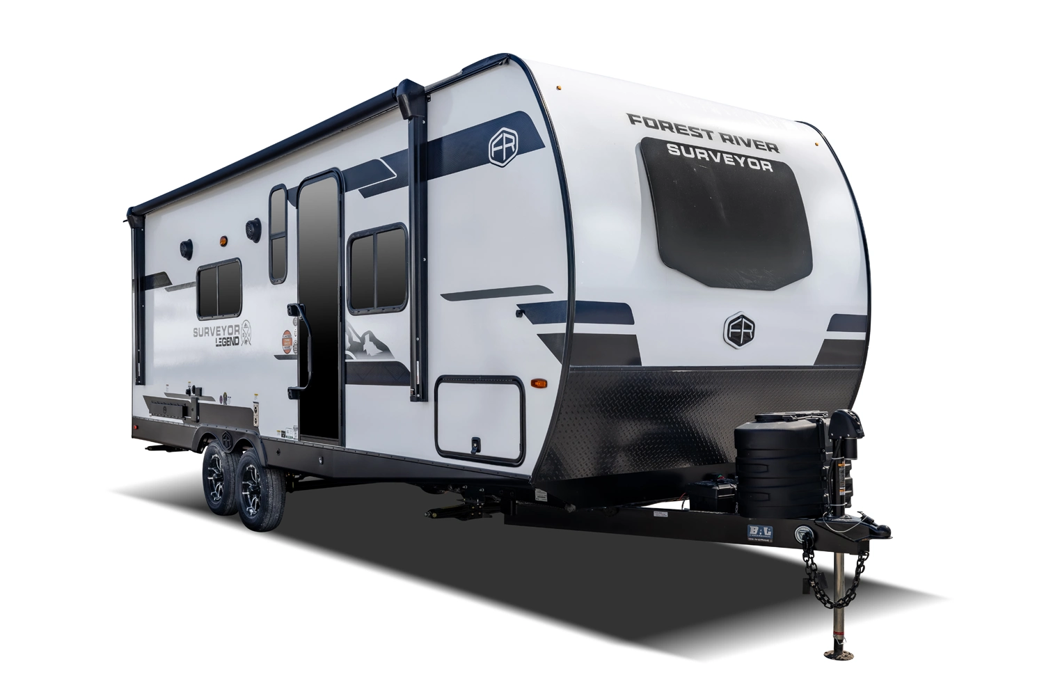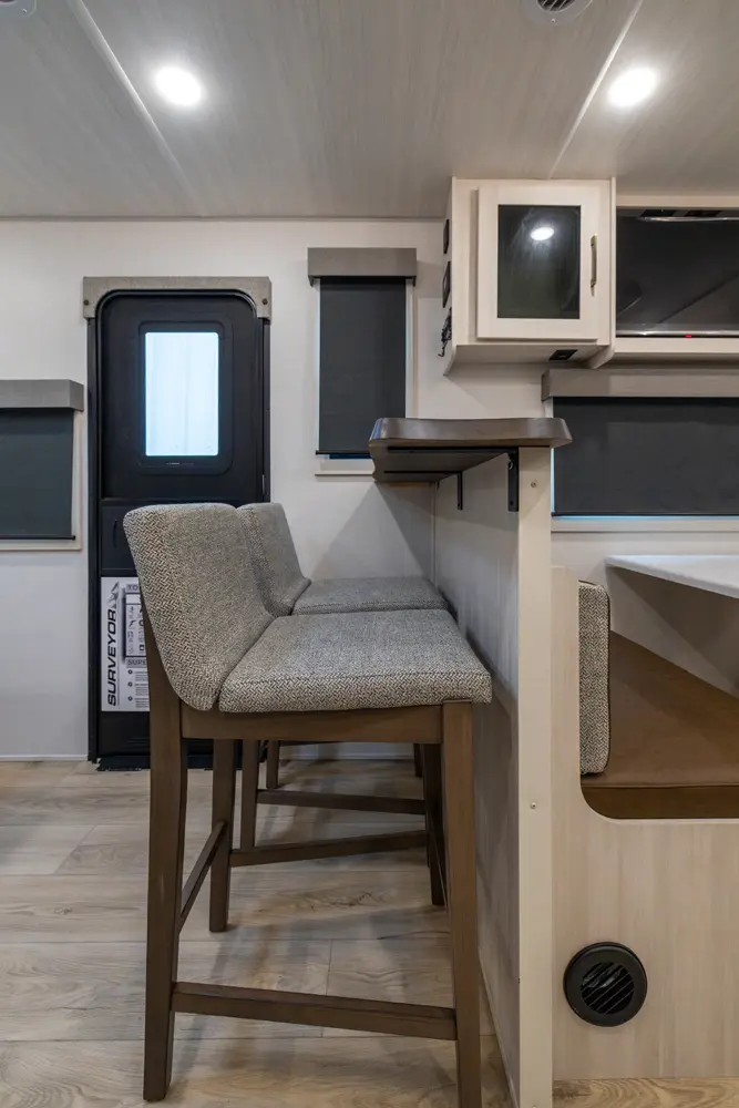 This 27' travel trailer features a front Queen bedroom with dual wardrobes and overhead storage. The kitchen includes a 10 cu. ft. 12V refrigerator and stovetop. Living space includes a sofa and a breakfast bar with two stools. The rear bathroom offers a shower, toilet, and sink. Exterior amenities include an 18' power awning with LED lights and a pass-through storage compartment.