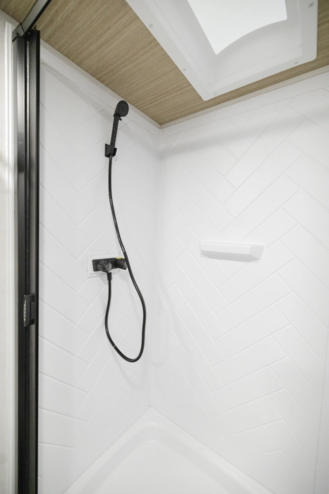 • Universal Docking Station Enclosed in Cargo Storage - Hookups Included: Cable & Satellite Switch, Fresh-Tank Gravity Fill, City Water, Black Tank Flush, Winterization Pump, Outdoor Shower, GFI Outlet, And Space Prepped for Solar Panel Controller