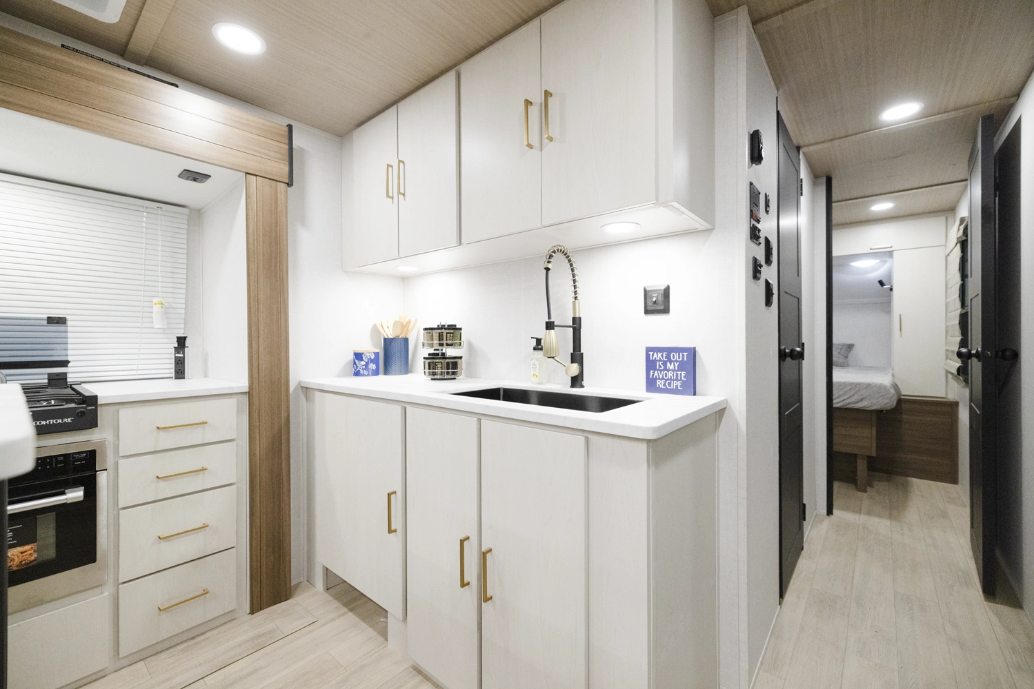 The 2800RL is our functional rear living floorplan that is sure to turn heads at the campsite. This travel trailer has dual opposing living slides that truly opens up the living space. With a large island countertop complete with four designer barstools, you get an abundance of features. With washer/dryer prep, king size bed, designated desk space, and an option for a 3rd A/C it seems too good to be true on a travel trailer.