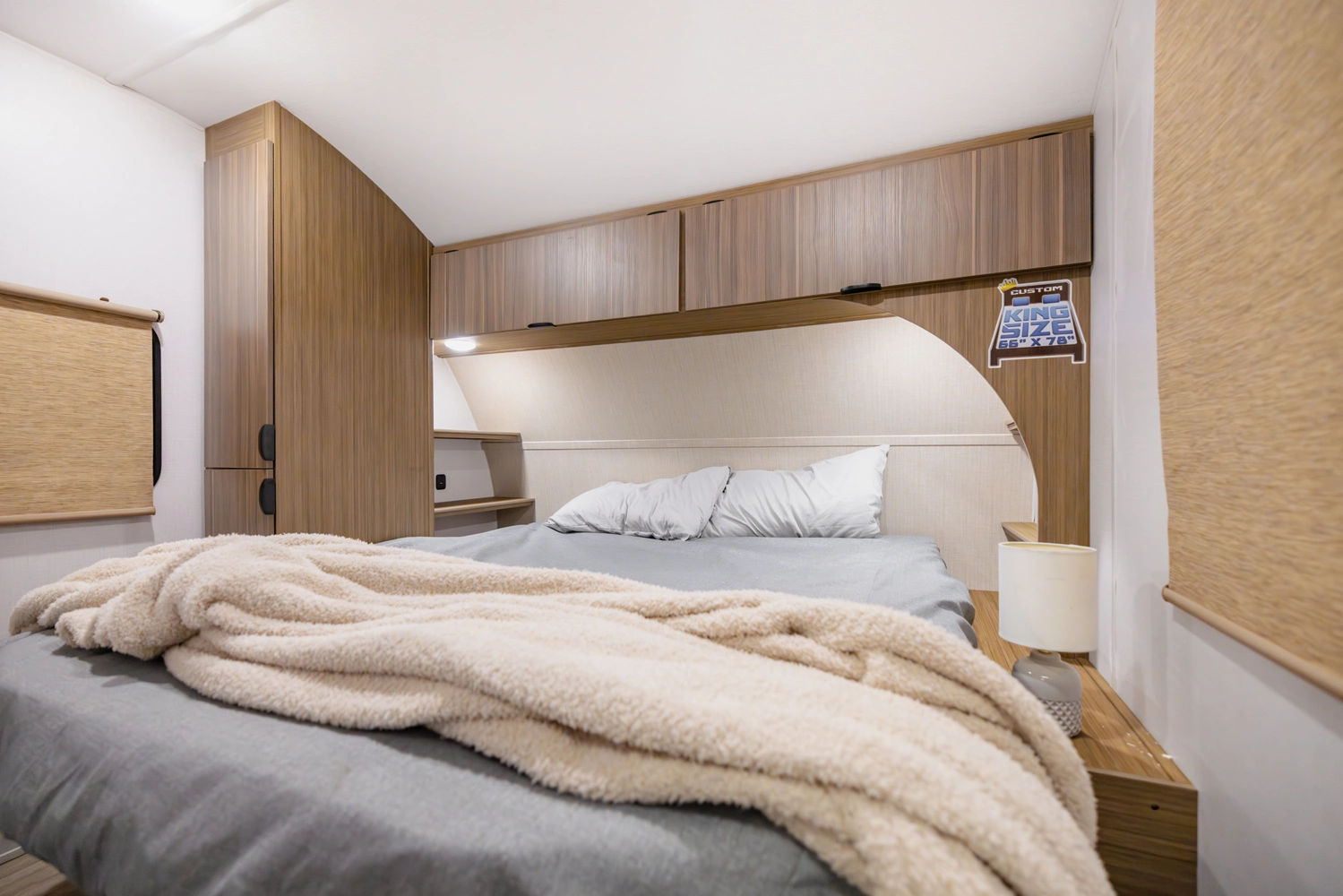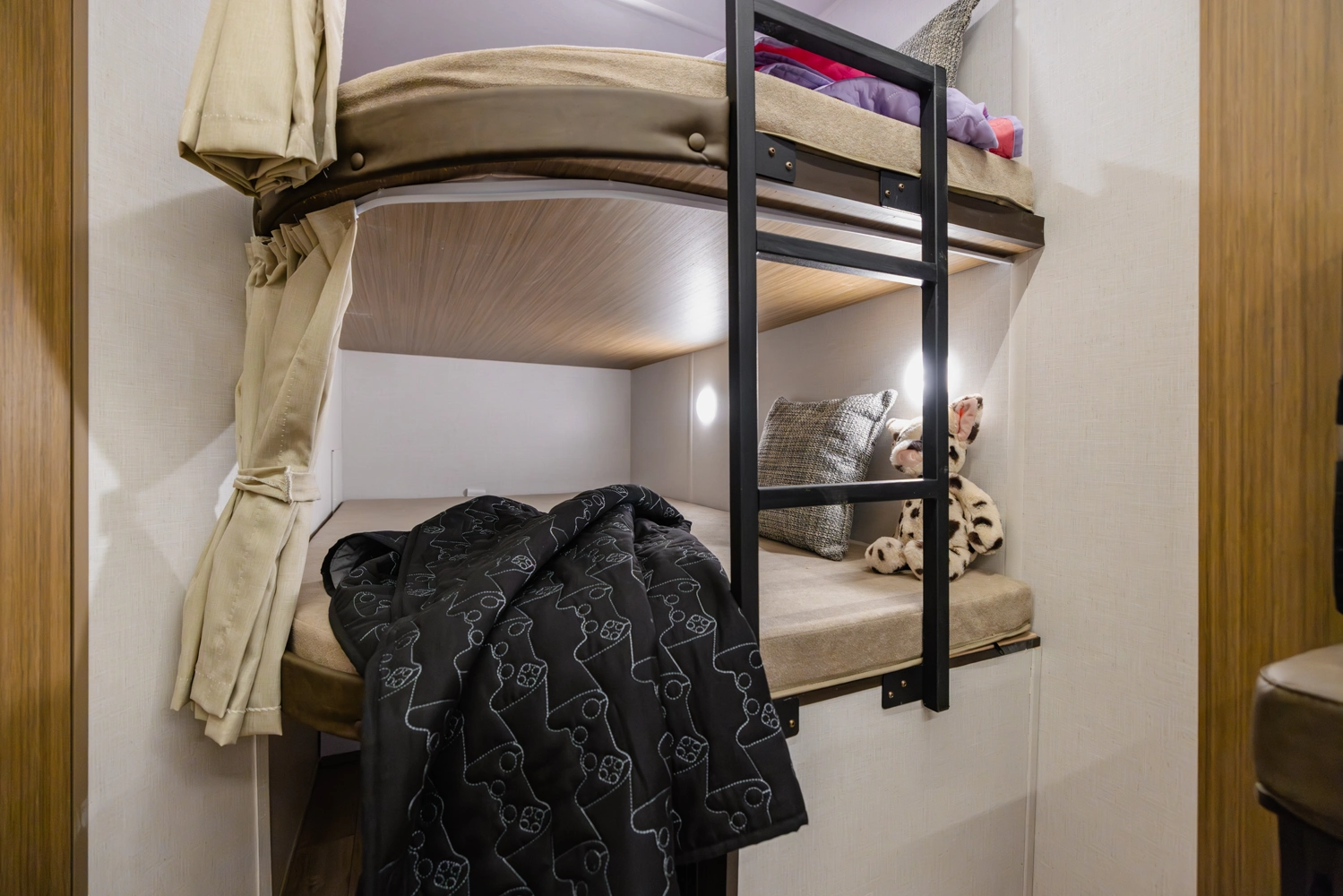 The 263BHXL is perfect for family travels. The rear features two oversized bunks for the kids, with plenty of space to stretch out. The grown-ups will sleep soundly in the front queen bedroom, which includes hanging closets and under-bed Stow N Go Storage. The living area includes panoramic windows and the Versa-Lounge. The kitchen provides a 11 CU. FT. refrigerator and TONS of storage.